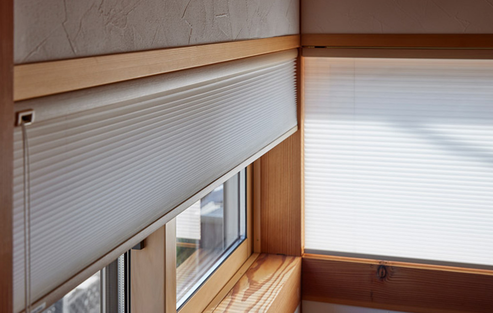 夏の暑さ、冬の寒さに効果を発揮するハニカムスクリーン。光を面で受けて拡散する様子は、障子の見え方に似ている透け感や色、光の表情を楽しみたいのであればプリーツスクリーンを。断熱性やプライバシーを求めている方はハニカムスクリーンを選ぶといいでしょう。