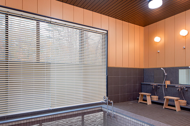 周囲に別荘が数軒隣接していることもあり、窓にはウッドブラインド「クレール防炎・耐水タイプ」を選定しました。ヘッドボックス内部の金属部品は、錆に強いステンレスを使用しているため、浴室でも安心して使用できます。