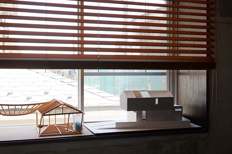 この家に隣接した階段を往来する人からよく見えるアトリエの窓。手がけた物件の模型を並べてショーウィンドウ風に
