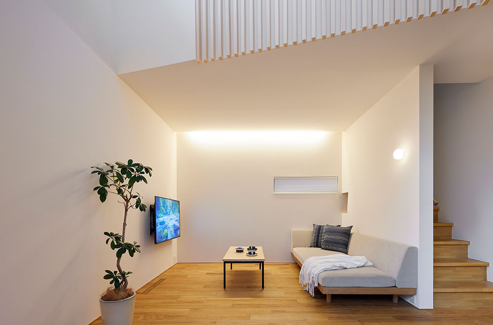 リビングの吹き抜けにある東面と南面の高窓からは、たっぷりの光が室内に注ぎます。窓枠の内側には、暑さ対策とプロジェクター使用時の遮光を兼ねて電動のロールスクリーンを設置しました。