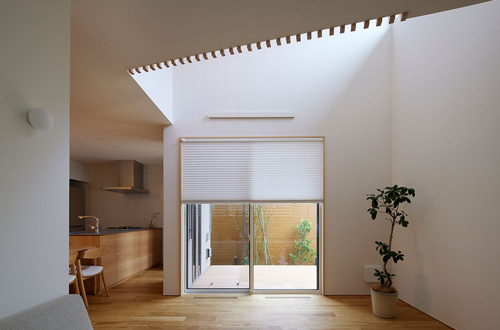 - 雪見障子のように周囲の視線を遮りつつ、庭を楽しめるのも魅力。リビングの掃き出し窓は、あえて窓枠を木材にして額縁に見立て、ハニカムスクリーンを引き立たせました。