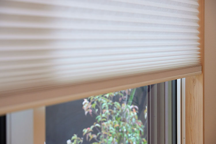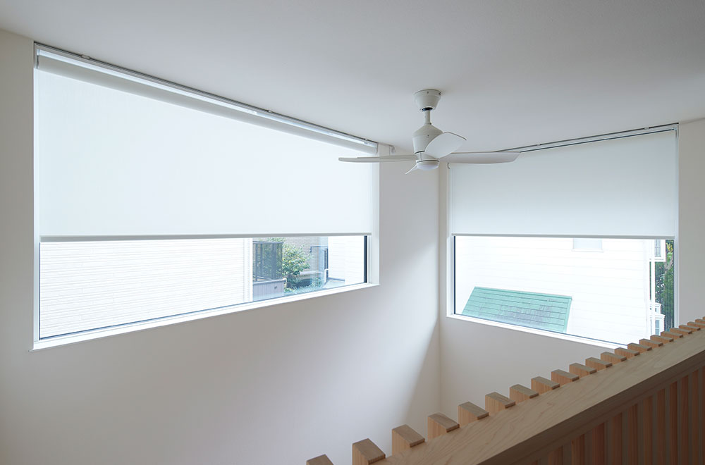 柳澤邸ではノイズのない美しい窓まわりを実現するため、ロールスクリーンとハニカムスクリーンといった“メカモノ”で統一しています。