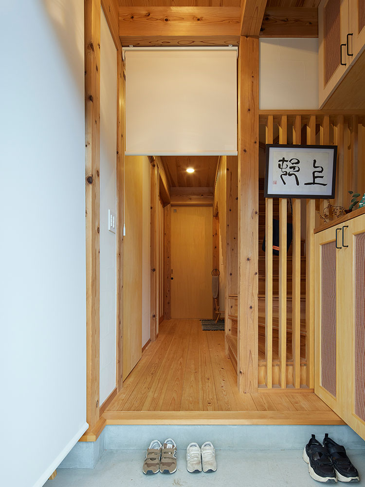 玄関側・廊下側の双方から使用するため、表裏の意匠差が少ない生地を選びました。色は周囲の漆喰の壁に合わせて、自然と空間に溶け込ませています。
