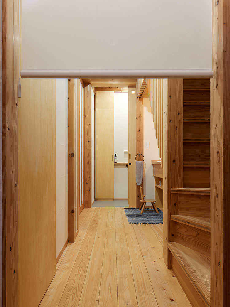 玄関横の納戸の目隠しにもロールスクリーンを活用。逆巻き仕様で壁面のようなフラットな印象に