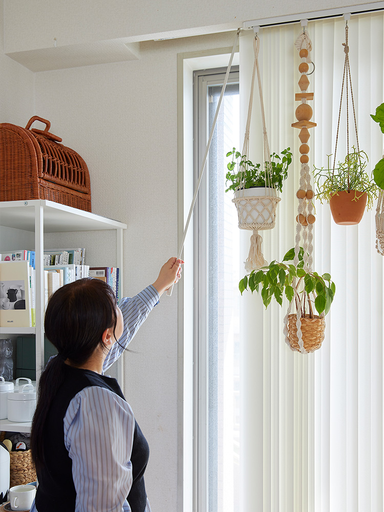 バーチカルブラインドの操作は「バトン式」。操作位置が高くループレスなので、猫のいるO邸でもケガや事故の心配がいりません。