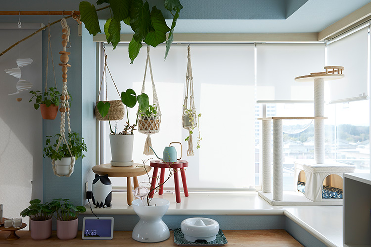 メゾネットタイプのマンションに暮らすOさんご夫婦は、14歳、10歳、8歳の娘さんと5人暮らし。2年前に保護猫を迎え入れてから、家がさらに賑やかになり、猫たちから日々たくさんの幸せをもらっています。猫たちが来てから生活が一変したことから、窓まわりのインテリアを猫の安全性と快適性を優先して見直しました。