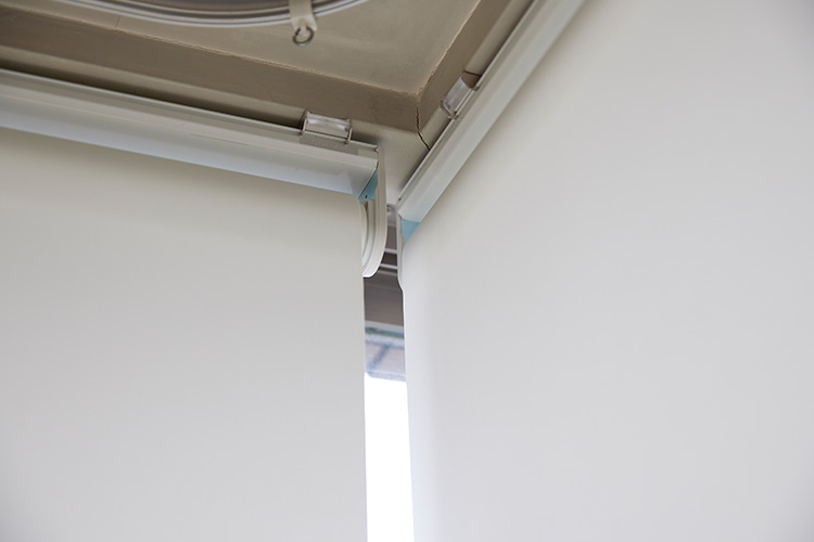 通常の取り付け方では、大きな隙間ができてしまうコーナー窓。今回は生地が手前に降りる「逆巻き仕様」で、コーナーの隙間を抑えました。