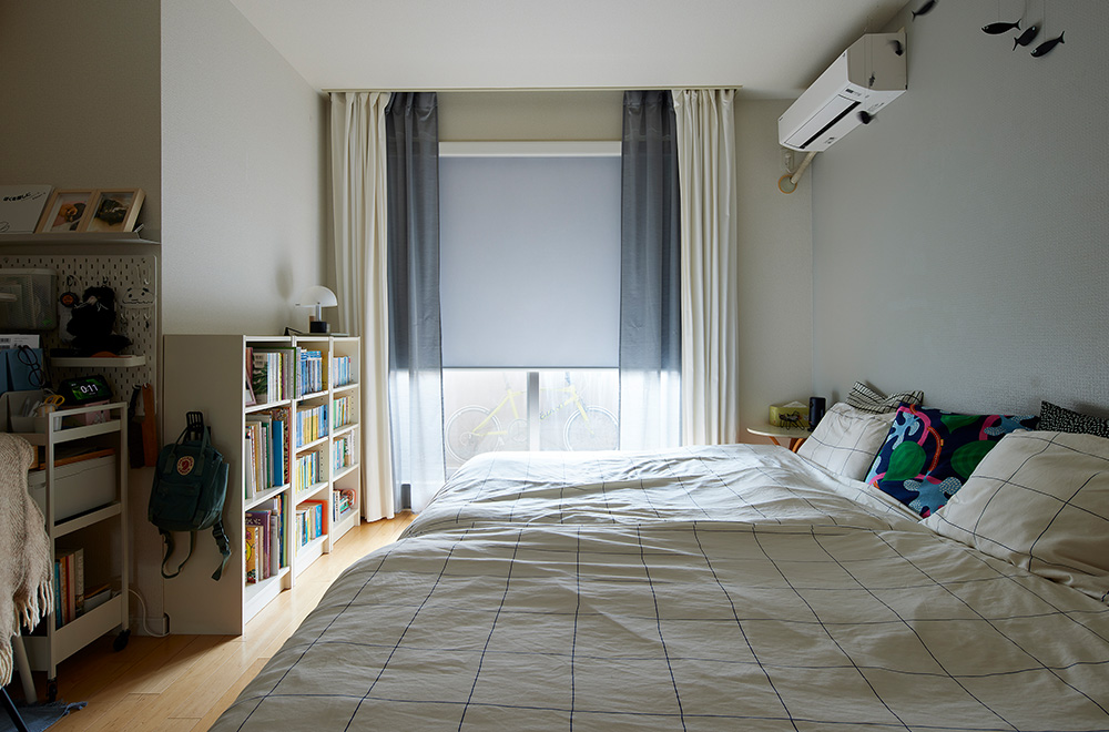 - 寝室は既存のカーテンを生かしつつ、ロールスクリーン「ソフィー」の「カバータイプ」を窓枠内にすっきり納めました。生地は裏面にバックコートが施された遮光性の高い「エルデBC」をチョイス。色はカーテンに合わせたグレイッシュな「グレイホワイト」。
