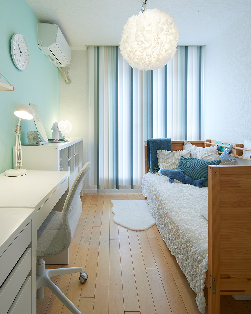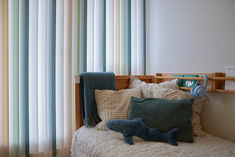 三姉妹の部屋は、それぞれ好きな色を壁紙に使っているO邸。長女の部屋は、壁の色に合わせてグリーンとホワイトの濃淡を組み合わせたバーチカルブラインド「アルペジオ」ミックスルーバーを設置しました。不透明生地は「エルデ」、レース生地は「ミラーレース遮熱」。単色とは違った上品で奥行きのある窓まわりが完成しました。