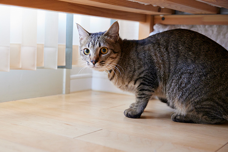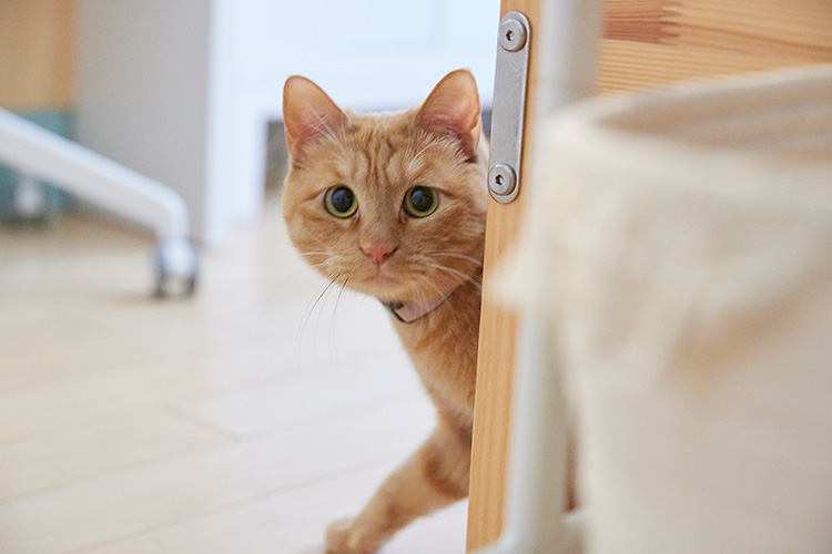 キジトラ猫のキキくん。追いかけっこやかくれんぼが大好きで、普段は走り回っているそう。撮影中は警戒してじっと隠れていました。