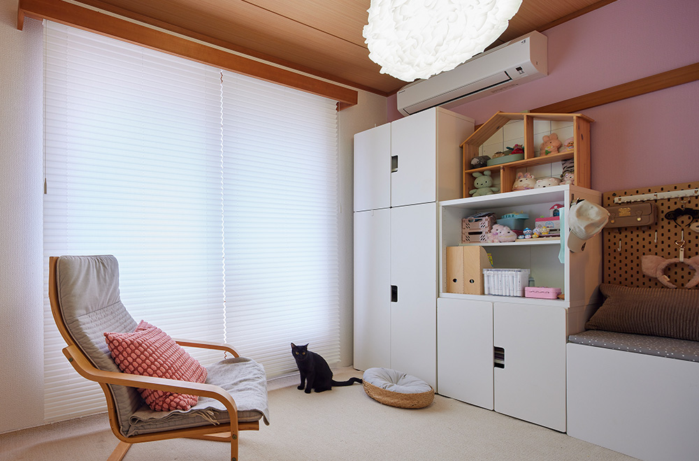 ピンクが好きな三女のために和室を可愛くリメイク。壁をピンクに塗り替え、カーペットを敷きました。窓はナチュラルなプリーツスクリーン「もなみ」を設置。生地は、コットンのような自然な織りが特徴の「フェスタⅡ」の「ミルキーホワイト」。プリーツ加工の折り目が生み出す陰影は、生地の風合いを際立たせ、既存の障子とも美しく調和します。