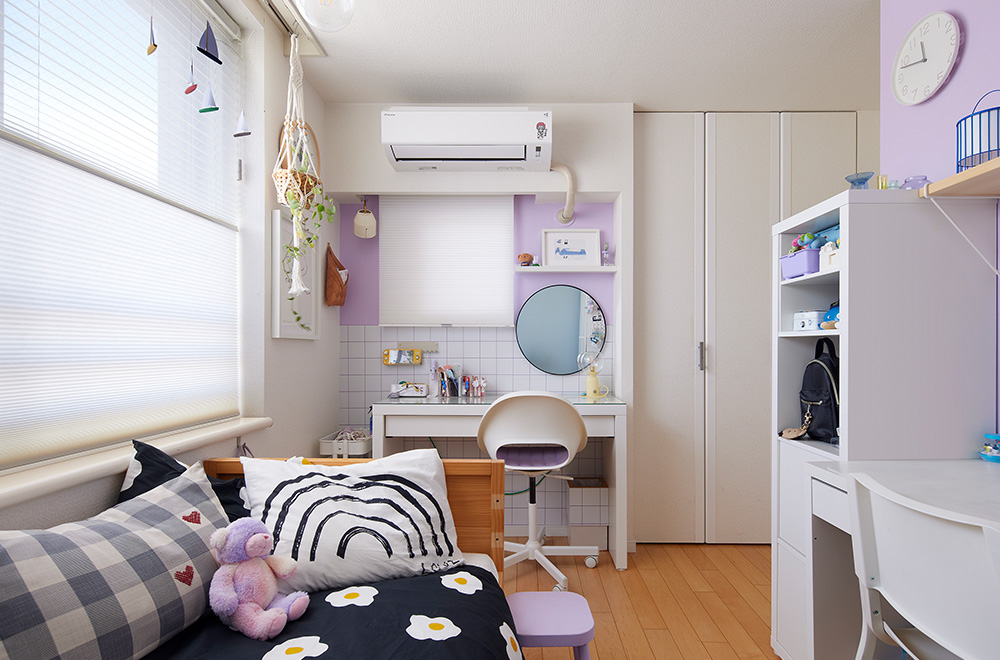 次女の部屋は、隣から見えるため、ハニカムスクリーン「レフィーナ25」の「ツインスタイル」を選びました。透け感の異なる上下2種類の生地の配分を調整して、採光と外からの視線を自由にコントロール。スクリーンを降ろした状態でも心地よい光が入ってくるようになり喜んでいるそう。小窓は1枚生地のシンプルな「シングルスタイル」を設置。