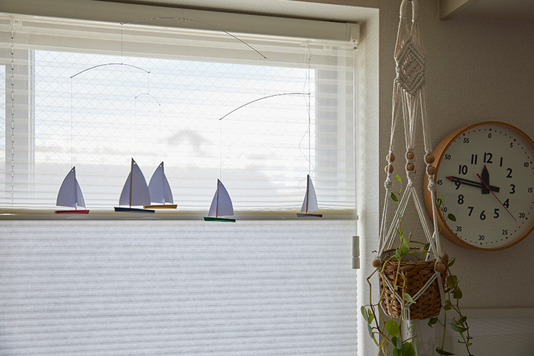 小窓のスクリーン操作は手で簡単に上げ下げする「コードレス式」。シンプルな形状でインテリアにもなじみます。