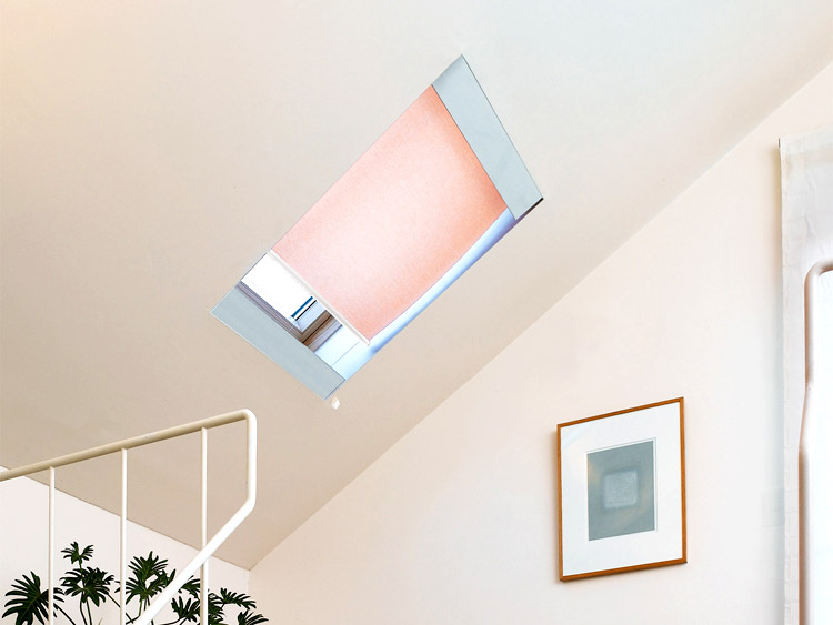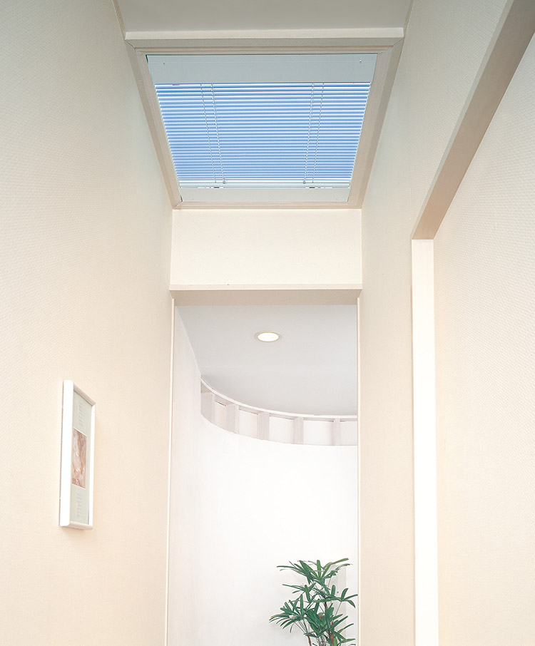 天窓は天井面から光を採り込み、空間全体を明るくしてくれます。取り付けられるのはロールスクリーンかアルミブラインドの〈傾斜窓タイプ〉か〈天窓タイプ〉のみ。生地やスラット(はね)がたるまない機構になっており、傾斜面でもすっきりと納まります。