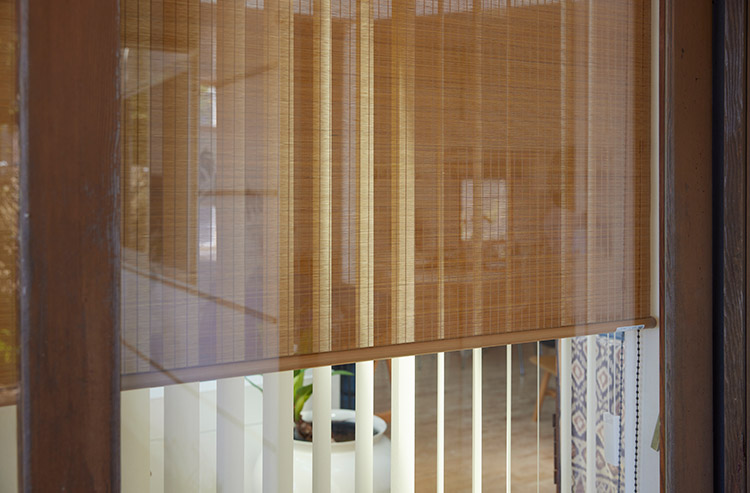 「設計時はバーチカルブラインドだけで考えていましたが、もっと庭の景色を楽しみたいなと。でも、全開にしてしまうと隣からの視線も遮りたい。じゃあ、どうするかと考えた時に、昔の日本家屋の縁側にかけていたすだれがヒントになり、この組み合わせを思いつきました」