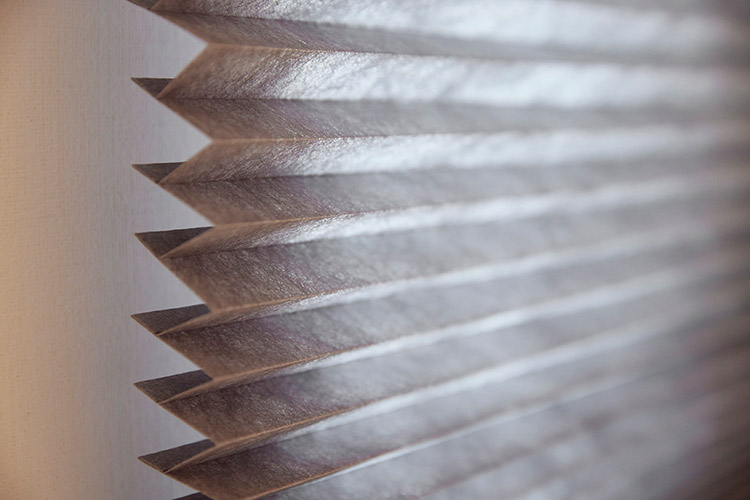 手漉き和紙のような、自然な風合いのプリーツスクリーン「もなみグランツ」を和室にしつらえた石丸さん。生地は「えにし」シリーズの「ハイミドリ」。光によって自然な濃淡の陰影が浮かび上がり、和らいだ心地よさを生みます。