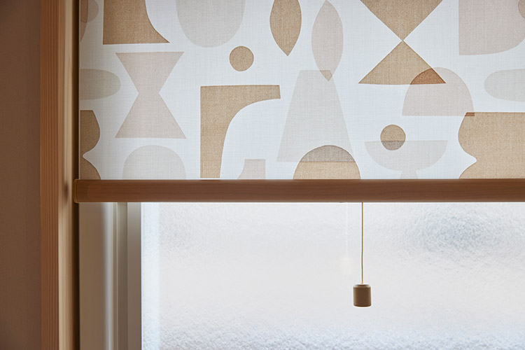 プライバシーを守りつつ、心地よい日差しを感じられるロールスクリーン。ナチュラルな色調で合わせやすい柄なので、さまざまな部屋におすすめです。 -