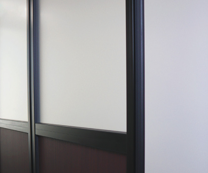 3段コンビネーションパネル パネルカラー:上・下段 マット、中段 木目ダークブラウン フレームカラー:ブラック レールカラー:ブラック コーナー納まり