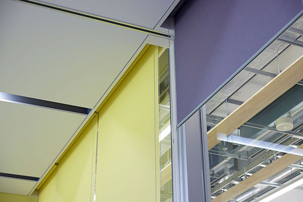 図書館の開架エリアは、大きな窓を持つものの、図書館として蔵書への直射日光を避けるためにロールスクリーンは必須となる。また、ロールスクリーンが降りた状態であっても、内部から外の景色が感じられ、かつ外観上も建物に馴染むよう、ダークカラーのシアータイプのロールスクリーンが導入されている。その他、会議室やサイエンスラボ(理科実験室)といった個室では、軽快に昇降操作できるチェーン式のロールスクリーンが採用された。生地は最大幅2700㎜まで対応可能で、ざっくりとした織りと光沢感が特徴の「ラフィー」シリーズ。全24色の豊富なカラーラインアップで、部屋ごとに異なるアクセントウォールに対応した。
